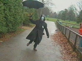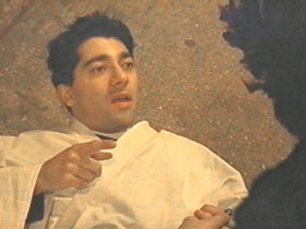 | Adamkin Skywalker, lying dazed on the ground, realises the girl at his side is the Princess. Because of the pouring rain, we actually shot this scene in a tunnel near London Bridge... hence the strange lighting. Oh well. |